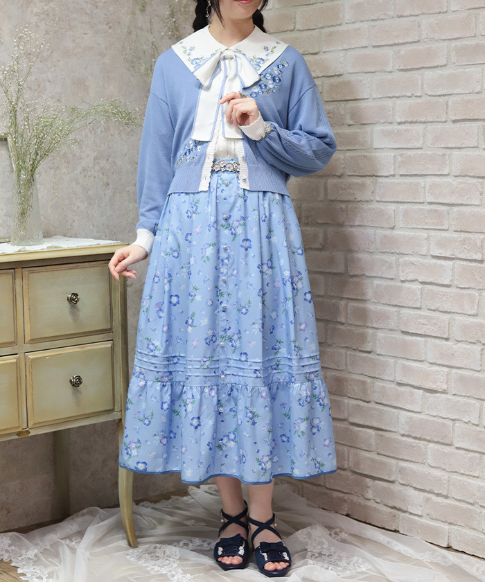 【設計】 採用原創粉蝶花刺繡呈現自然花色層次,細緻描繪花朵隨光影變化的色調。薄紗疊層荷葉袖修飾手臂線條,營造輕盈感。可拆式垂墜蝴蝶結設計增添造型變化,搭配撞色滾邊與同色珍珠釦,細節更顯精緻統一。 【搭配建議】 可搭配同系列單品打造整體造型,也能與裙裝、短褲或吊帶洋裝搭配,輕鬆呈現多樣清新日系風格。