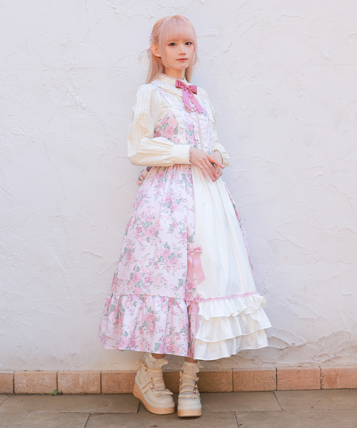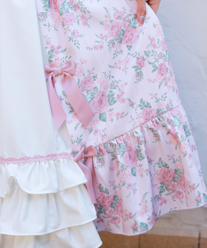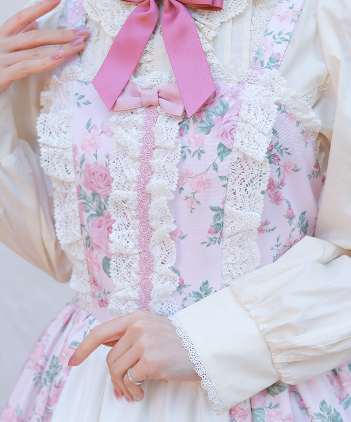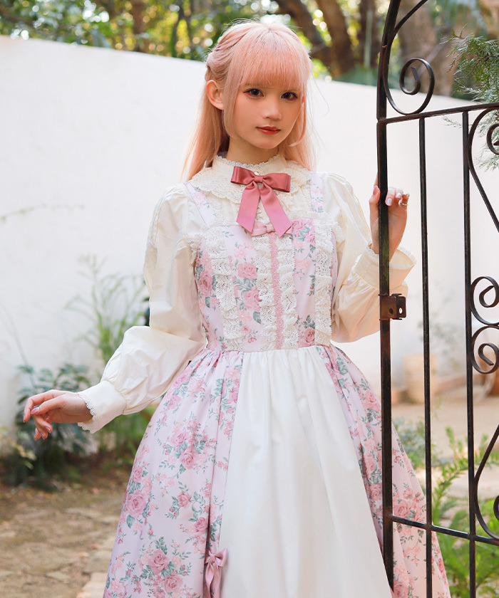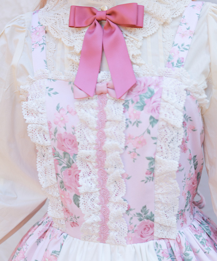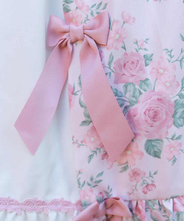 【設計】 中央拼接素色布料,展現華麗層次感的設計。粉色蝴蝶結為亮點,並大量運用托ーション蕾絲裝飾,營造浪漫華美氣息。