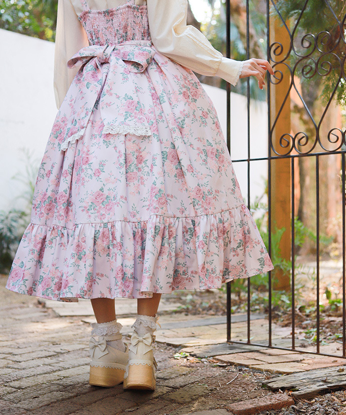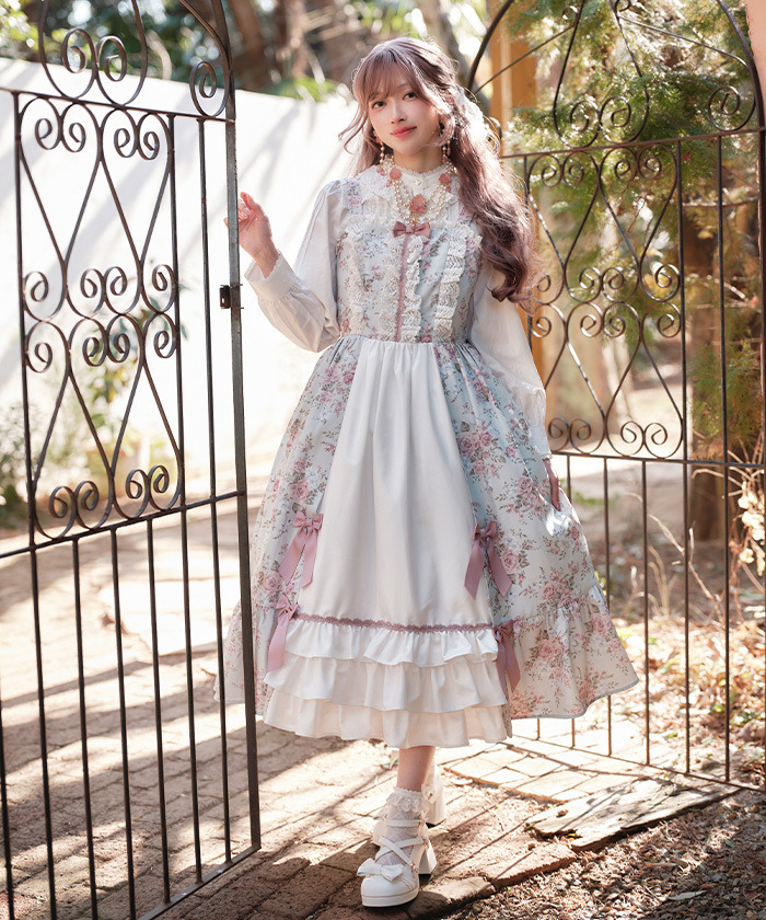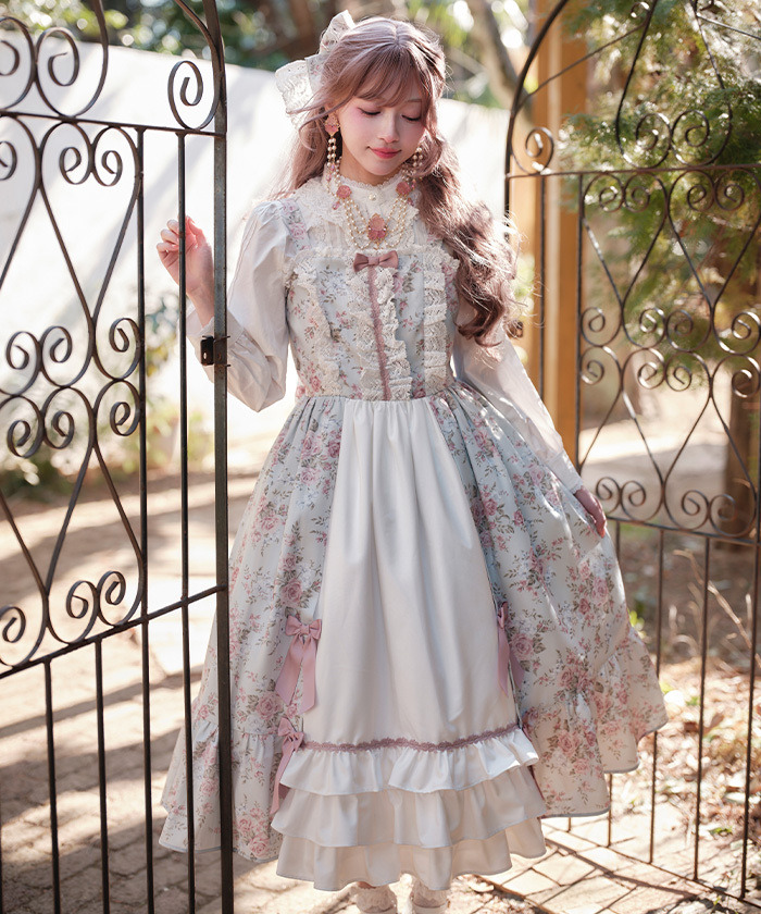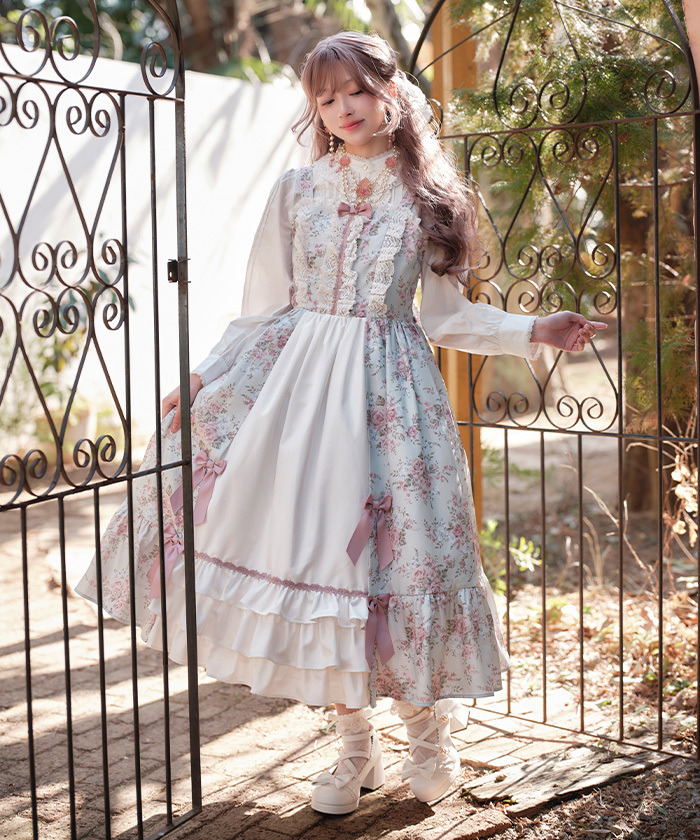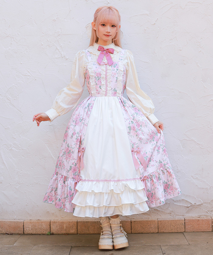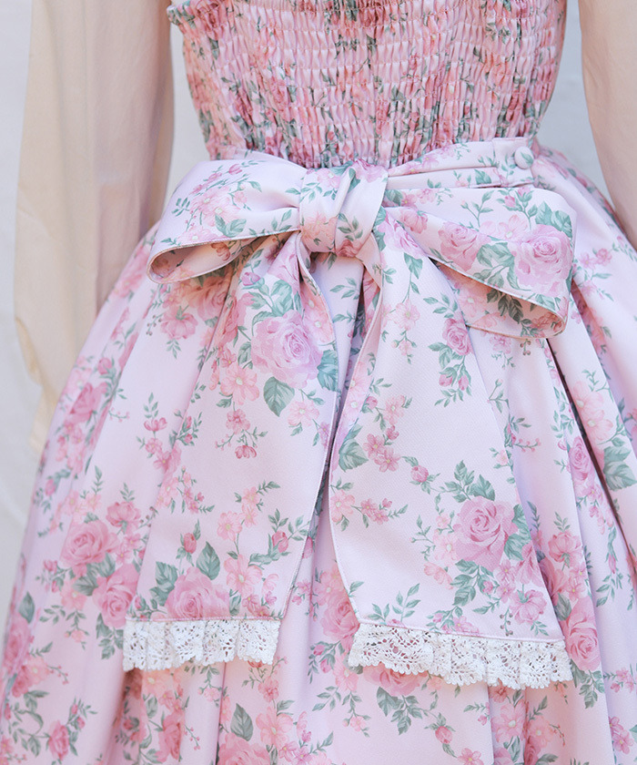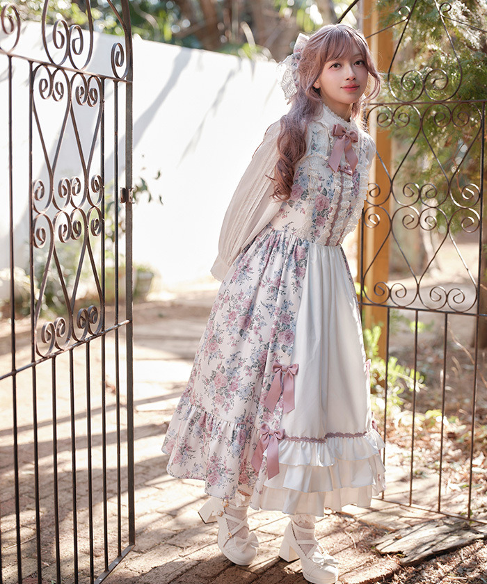 【設計】 中央拼接素色布料,展現華麗層次感的設計。粉色蝴蝶結為亮點,並大量運用托ーション蕾絲裝飾,營造浪漫華美氣息。