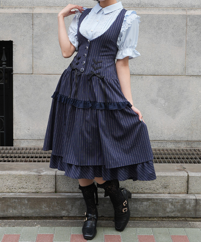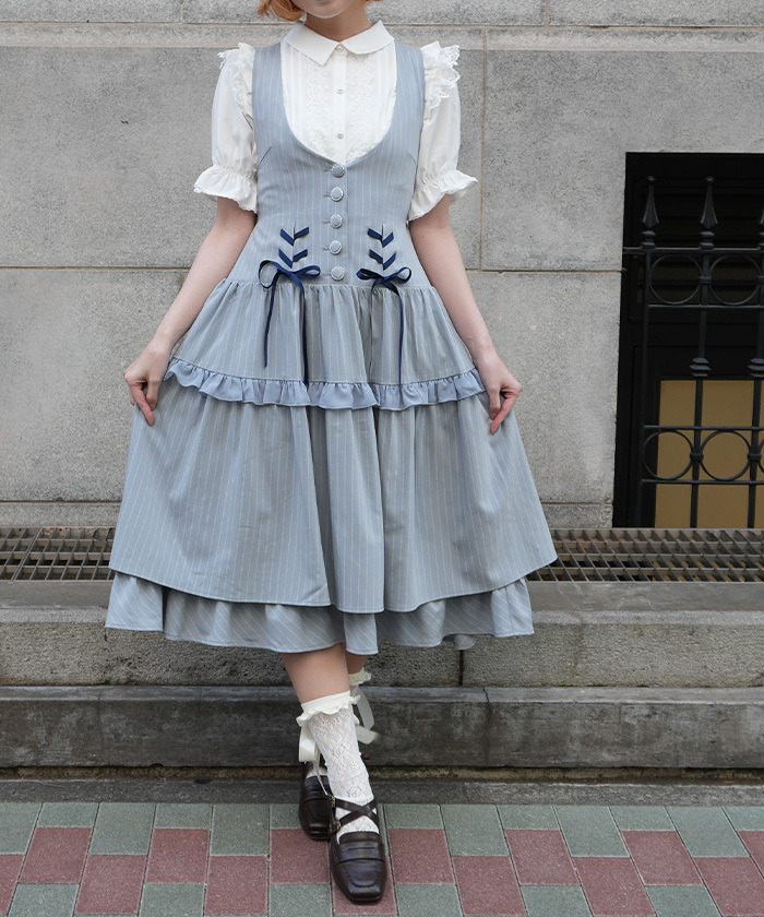 【設計】 以經典細條紋布料打造的吊帶洋裝。 低腰剪裁讓上身線條更加俐落修長,裙襬則向下自然展開成蓬鬆的蛋糕層次輪廓。 包布鈕扣與綁帶設計增添甜美細節。 裙襬露出斜裁荷葉邊裝飾,為整體造型增添存在感。 後腰採用鬆緊帶與綁帶設計,可依需求調整版型。