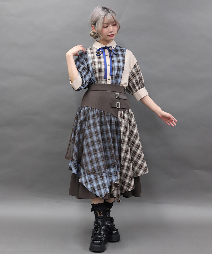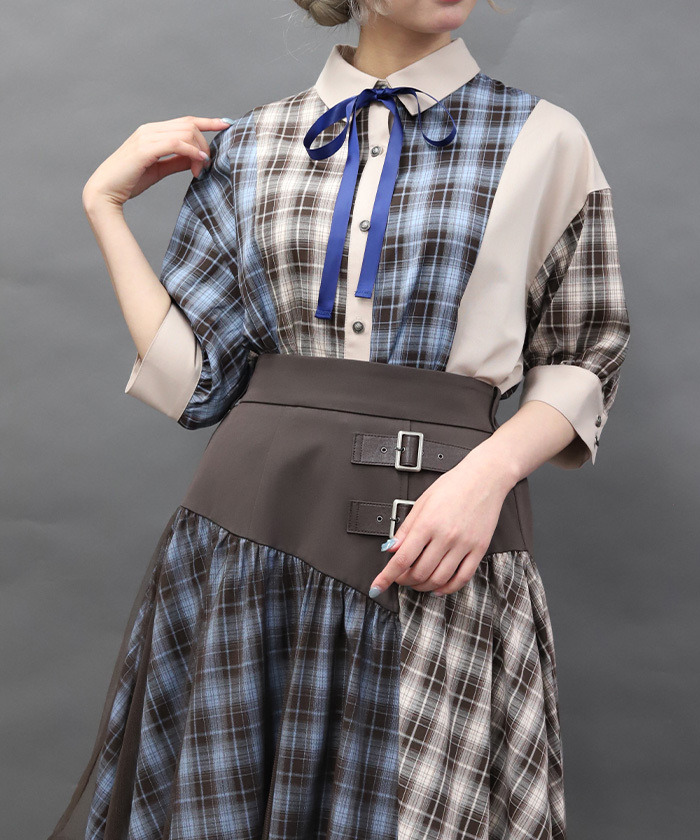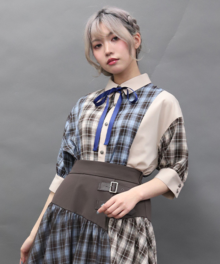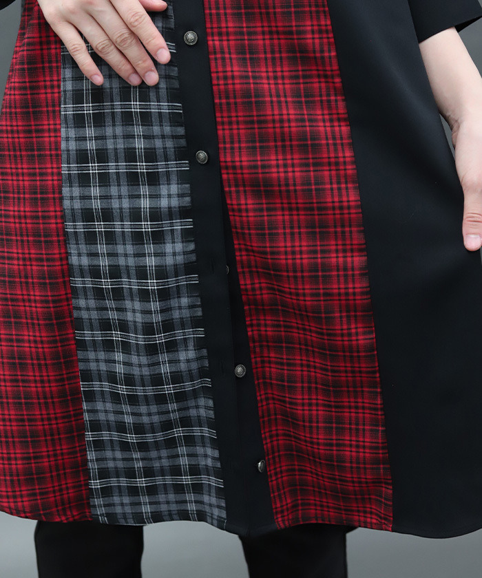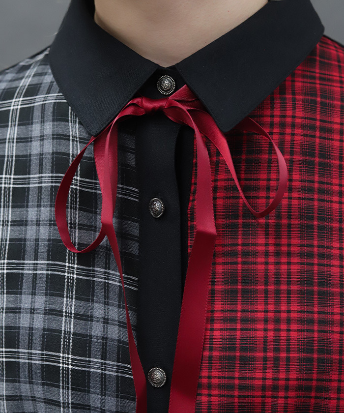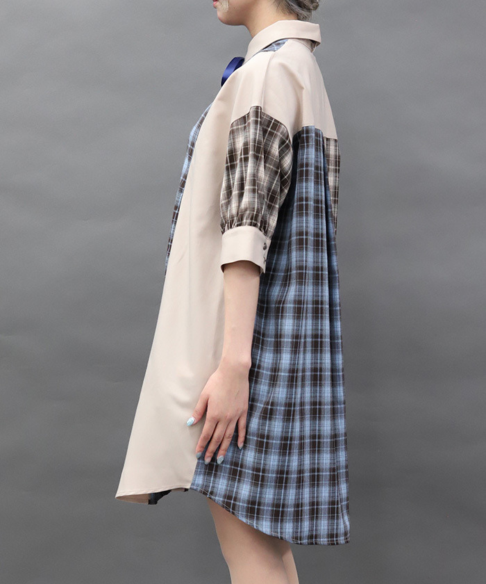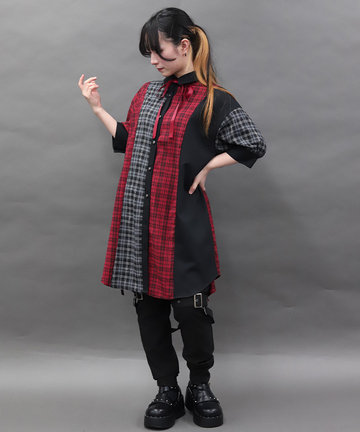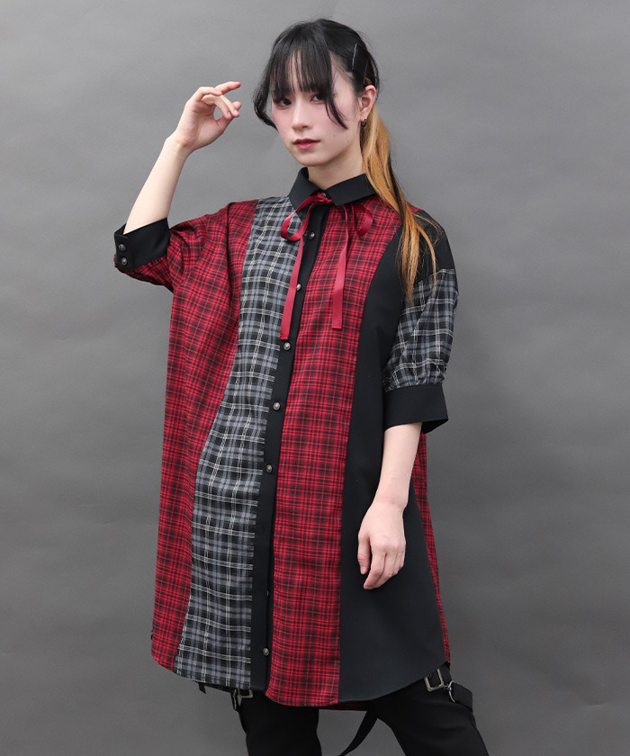 【設計】 大膽運用格紋與素面布料拼接,呈現撞色層次感。寬鬆的襯衫洋裝剪裁帶來舒適自在的穿著體驗,領口蝴蝶結可拆卸,依造型自由變化。提供黑×紅暗色系與摩卡×淺藍甜美配色兩種選擇。