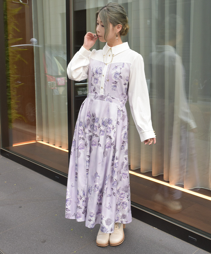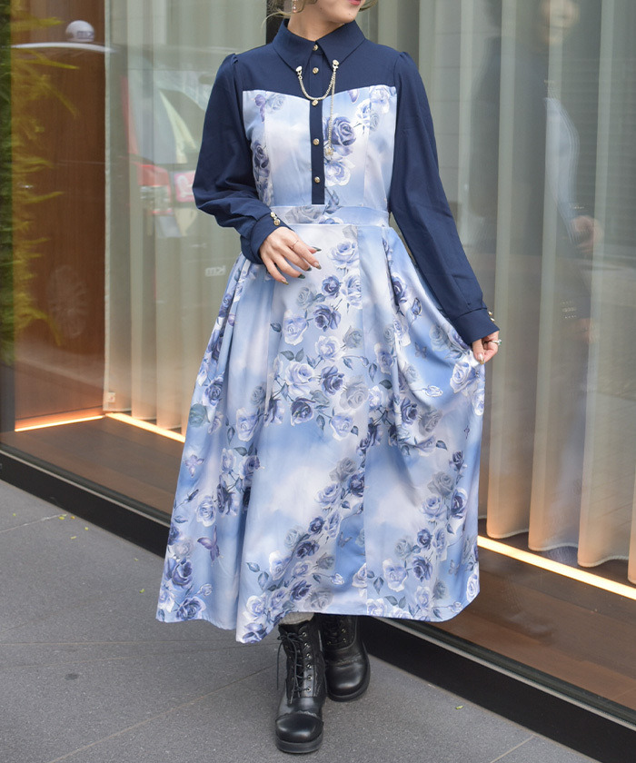 【商品介紹】 以水墨藝術風格描繪的大朵玫瑰原創印花格外吸睛,展現凜然氣場的翻領洋裝。