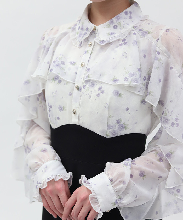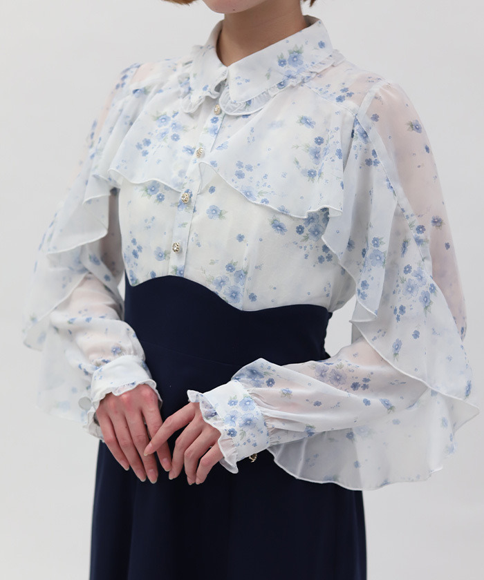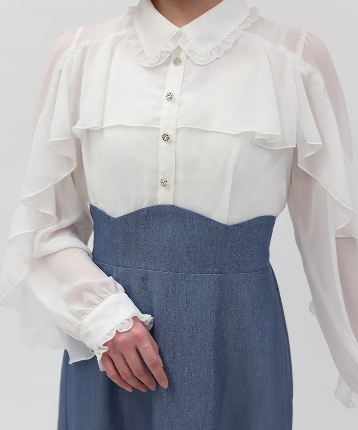 【設計】 採用帶有花卉圖樣與仿丹寧感藍色的春季感面料製成的拼接洋裝。 上身使用帶有適度透膚感的雪紡材質,行走時輕盈搖曳的飄逸荷葉邊為設計亮點。 高腰剪裁展現修身顯瘦效果◎。 腰部後側為鬆緊設計,並附綁帶可調整尺寸與整體輪廓。 裙身以美人魚裙為靈感的剪裁線條,增添時尚流行感。