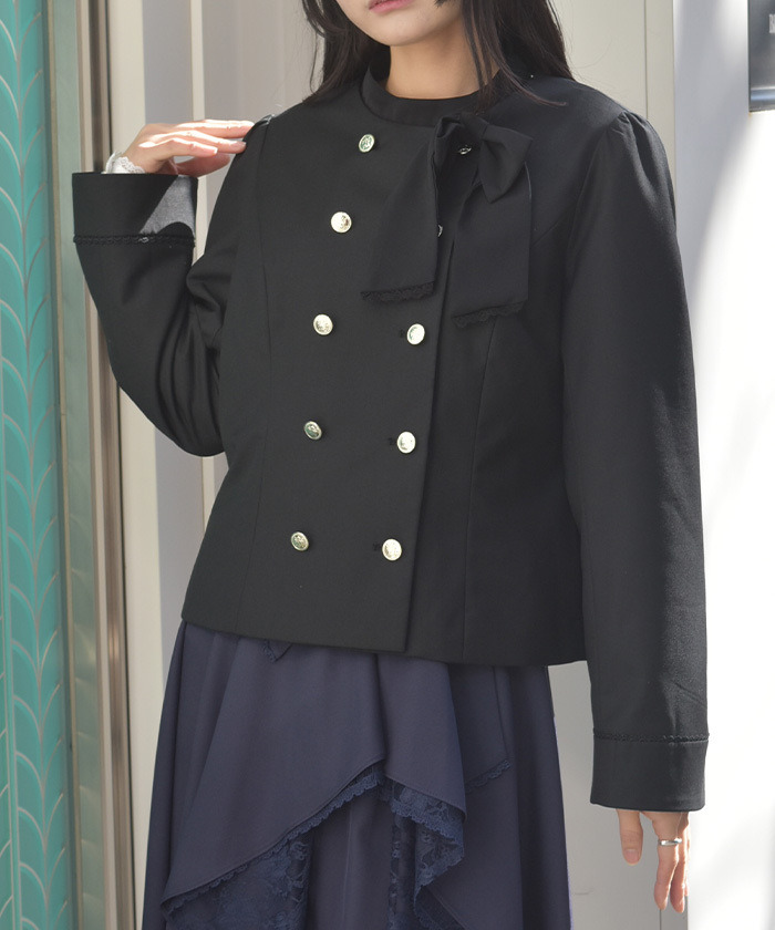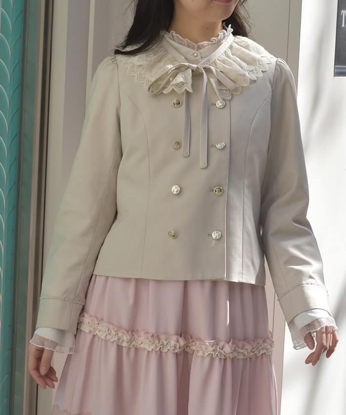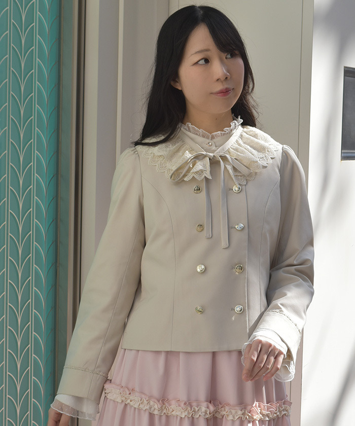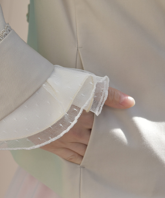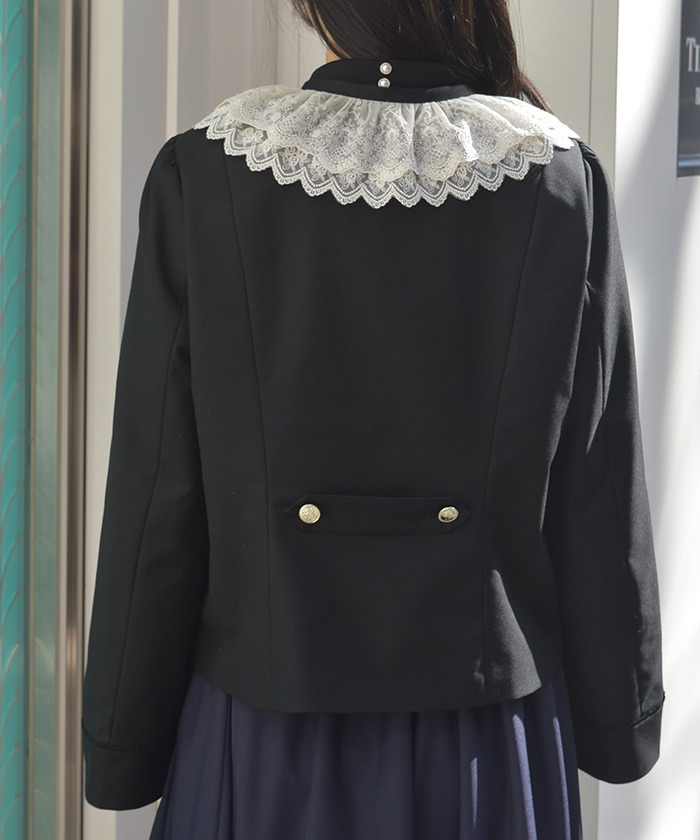 【設計】 雙層刺繡蕾絲領運用不同圖案增添細節感,微喇袖口搭配蕾絲滾邊切換設計,優雅層次分明。胸前金色徽章扣採香檳金低調光澤,後背拉片剪裁使整體輪廓俐落,呈現大人優雅氣質。 【穿搭建議】 建議搭配襯衫與長裙,打造華麗典雅的優雅造型。亦可單穿於洋裝或套裝外,輕鬆完成成熟高雅的日常或正式場合穿搭。