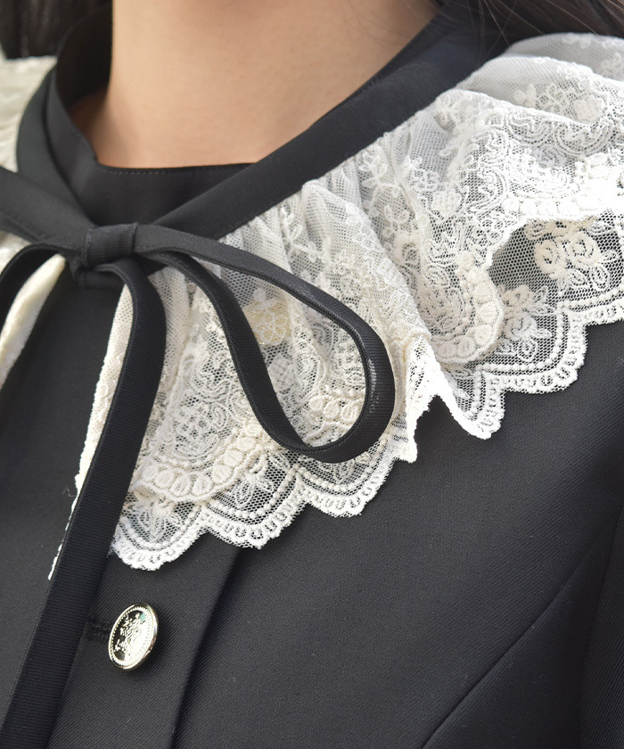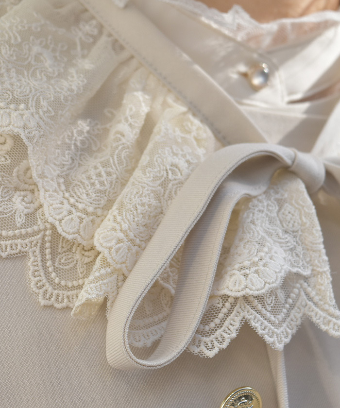 【商品介紹】 華麗蕾絲領設計的優雅外套,可拆卸蕾絲領後呈現俐落無領剪裁,兼具甜美與正式感,是出席宴會或特殊場合的理想單品。