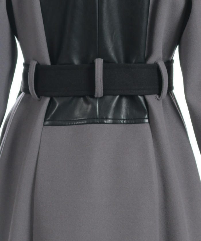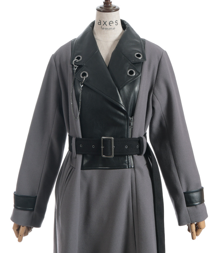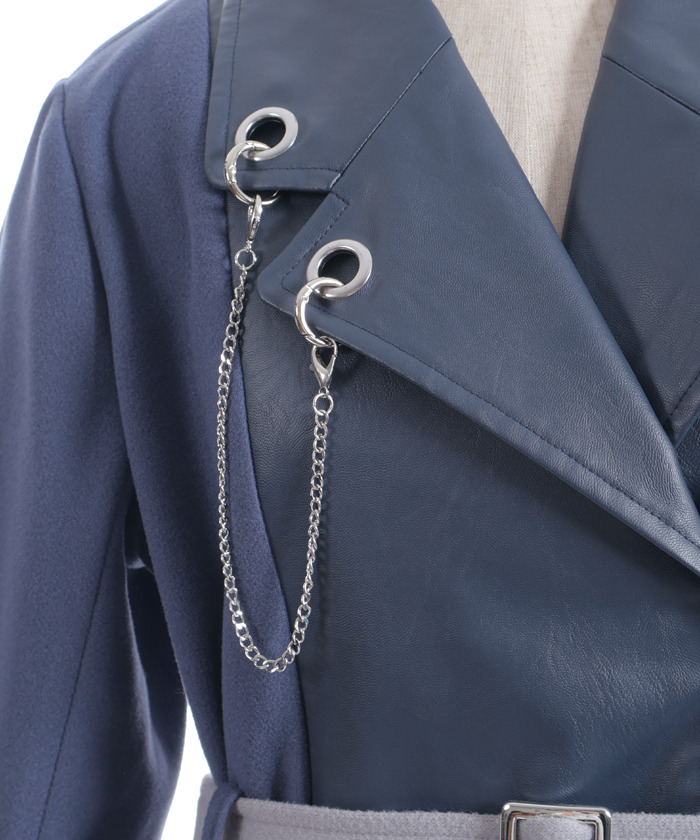 【商品介紹】合成皮革與異素材拼接賦予時尚印象的長版大衣。在優雅中融入摩登要素,演繹酷帥氛圍。