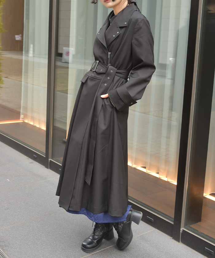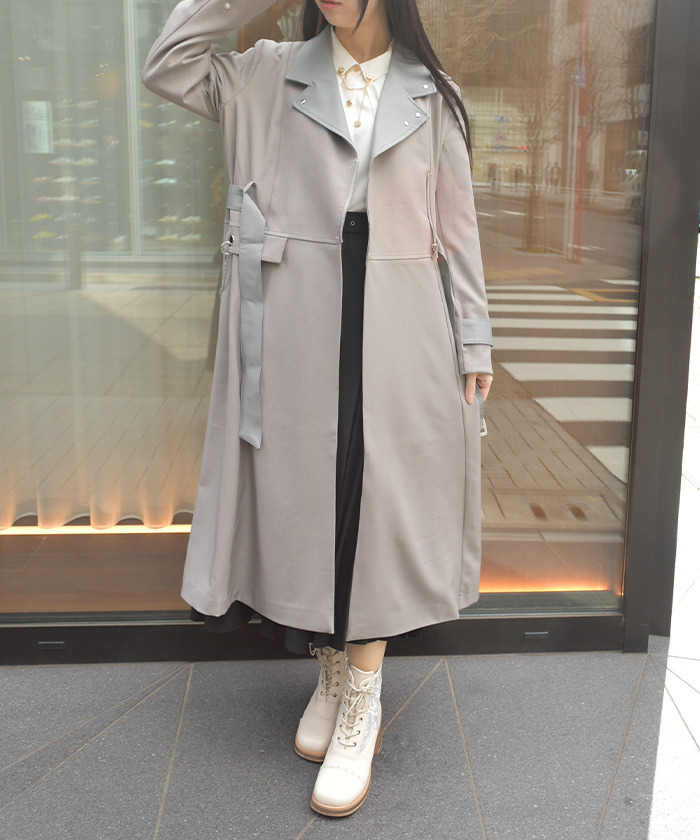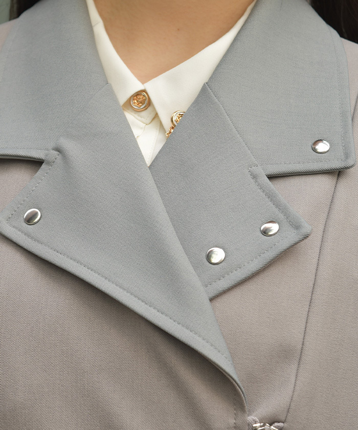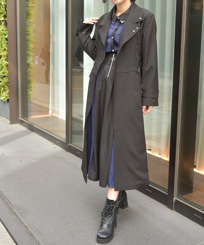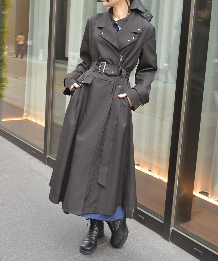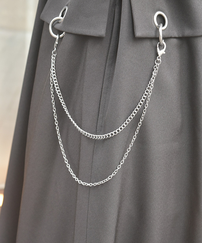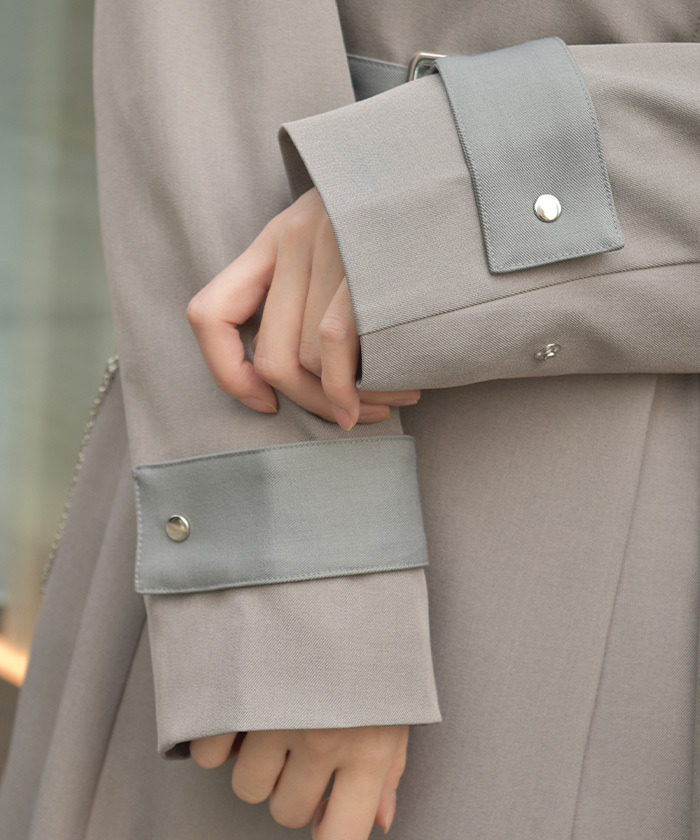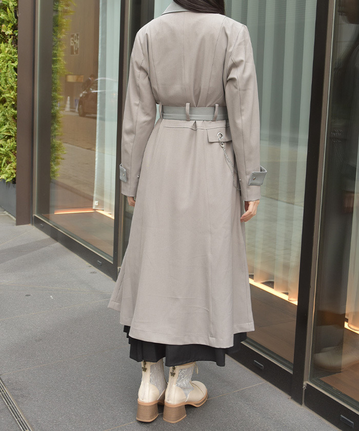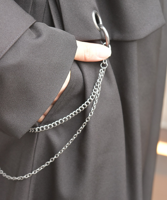 【設計】 俐落的領口與長版剪裁營造挺拔氣質,搭配金屬孔眼與鏈條細節,增添低調亮點。附腰帶可調整剪裁與曲線,輕鬆達到修身與增高效果。