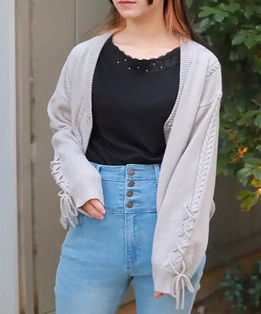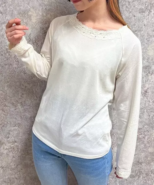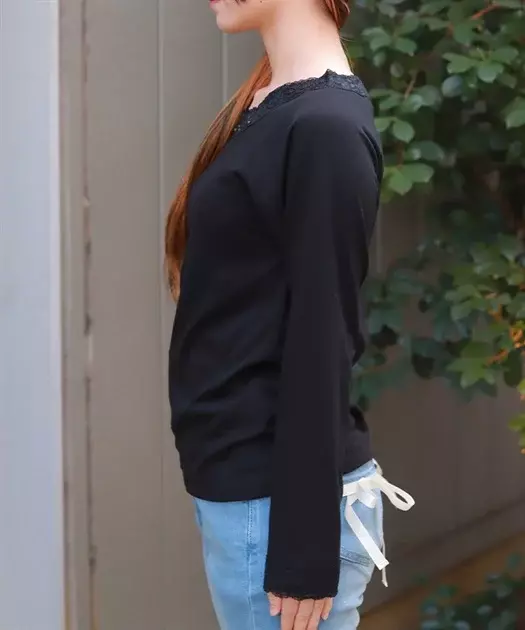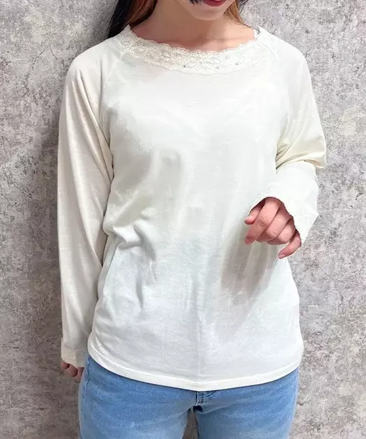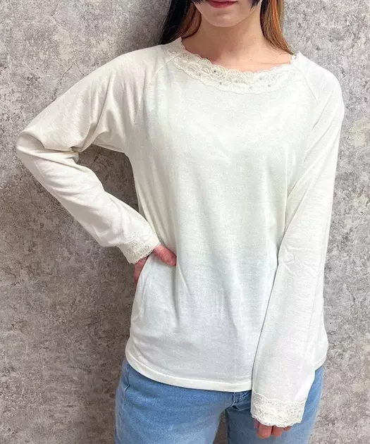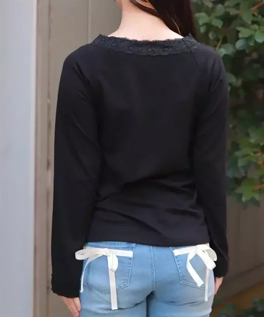 【設計】 胸前蕾絲上鑲有水鑽,低調閃耀,增添華麗感;袖口同樣加入蕾絲細節,即使作為內搭露出也能自然展現甜美氛圍,是層次穿搭的加分單品。