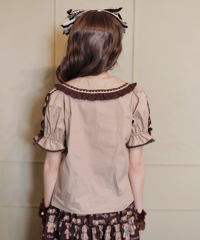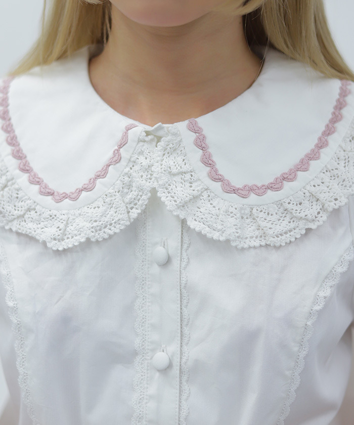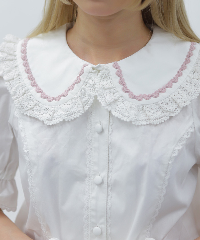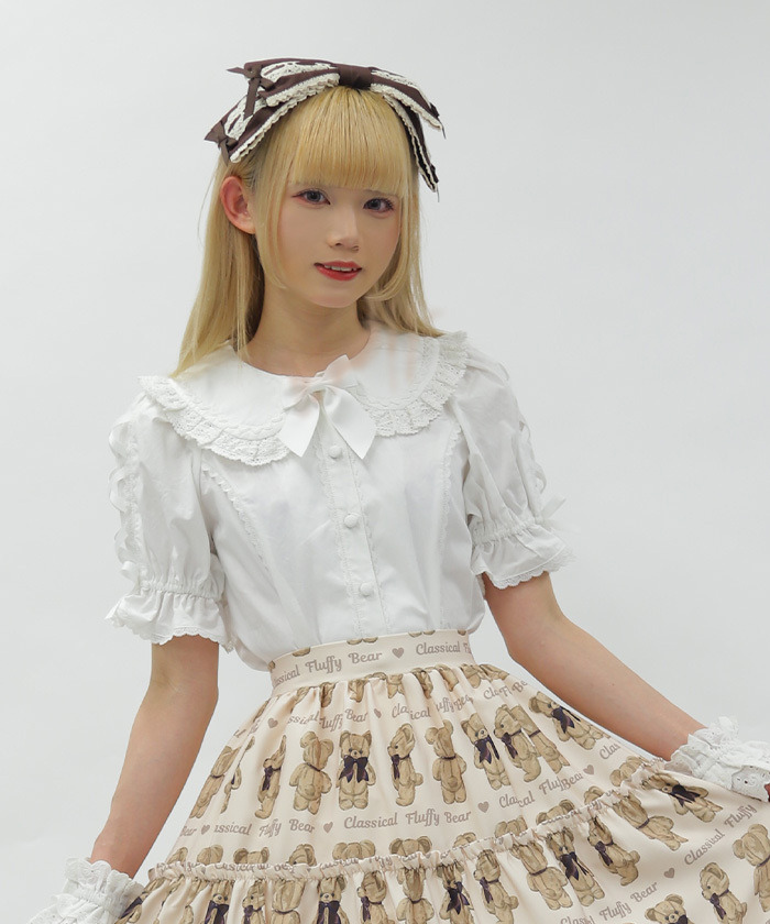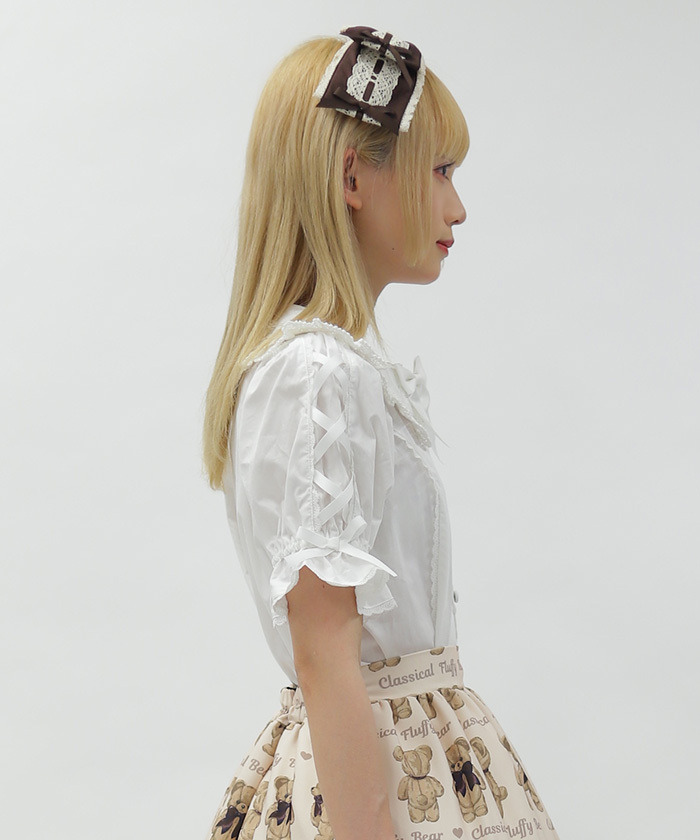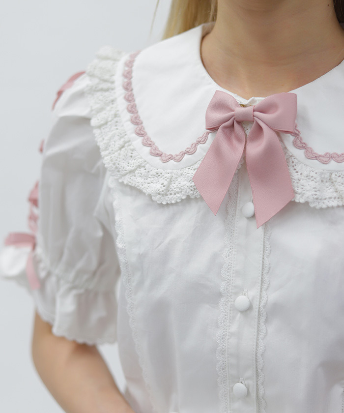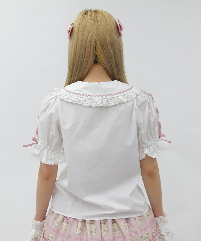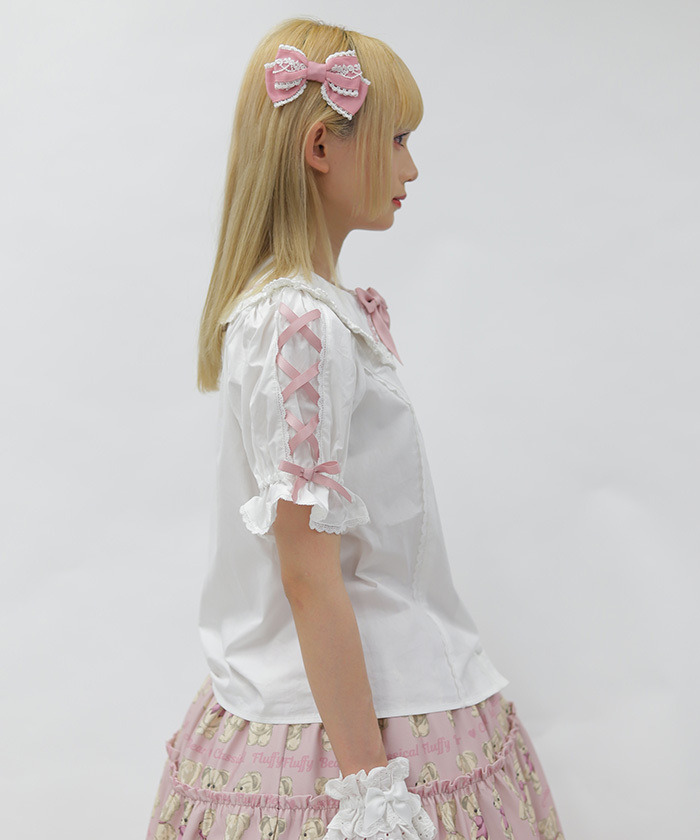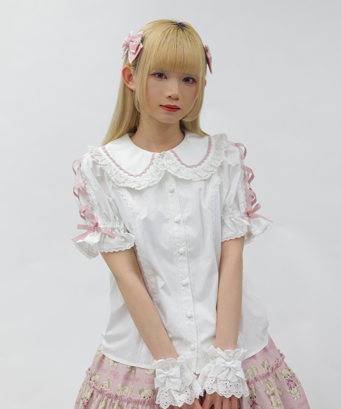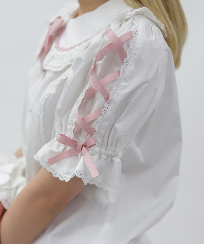 【設計】 袖子以霧面緞帶綁帶,搭配扭花蕾絲(トーションレース)和領口心形蕾絲,甜美又細緻,是少女風格的代表單品。