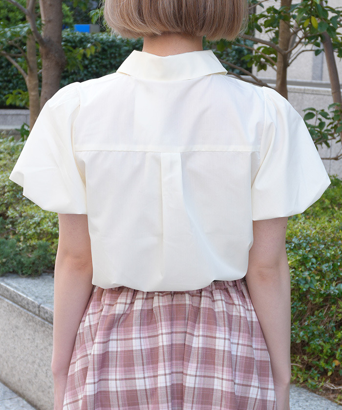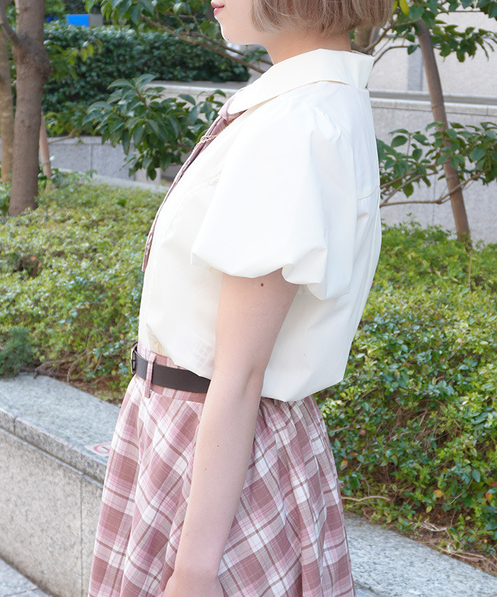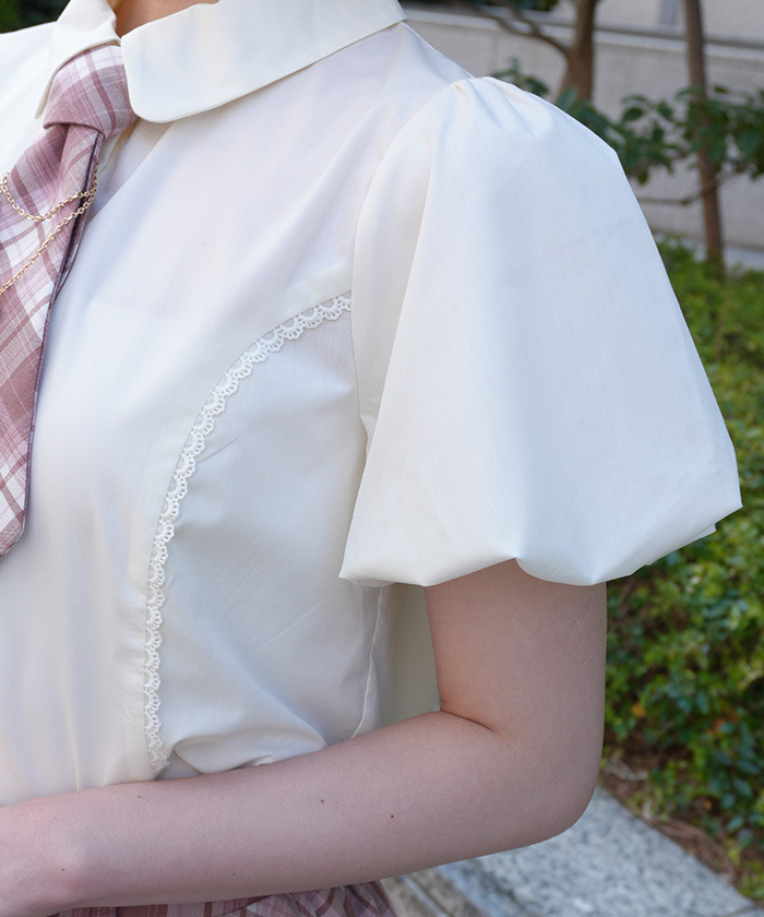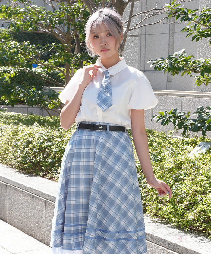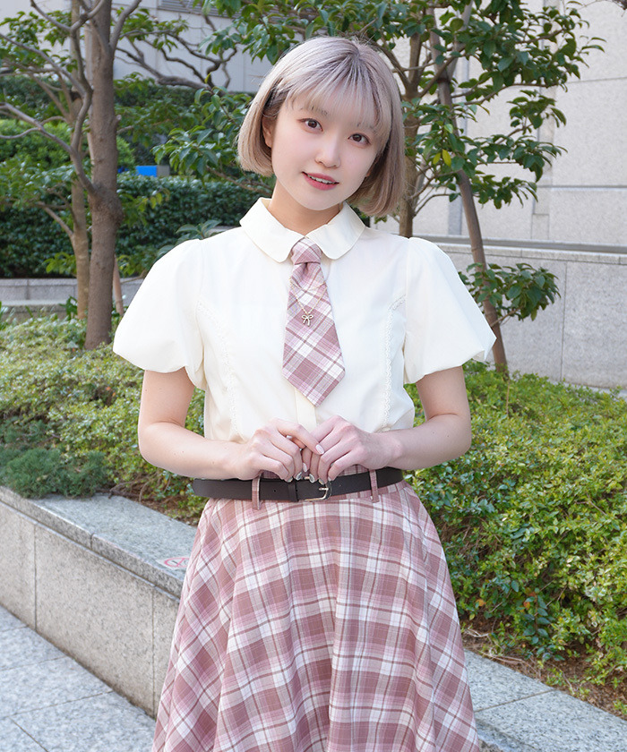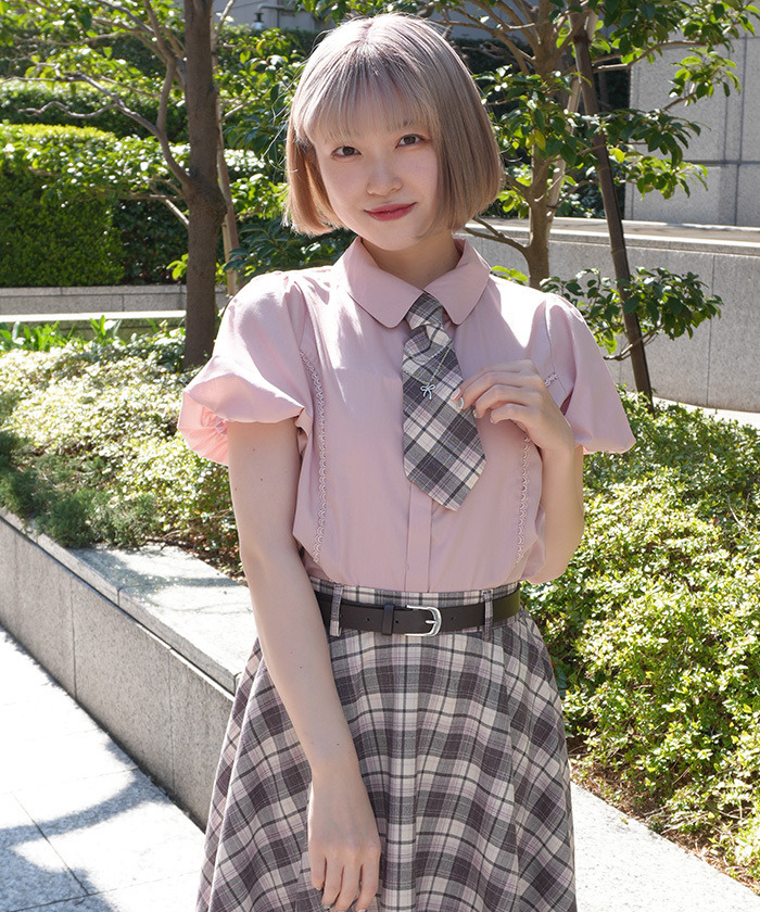 【設計】 附彩色格紋領帶,搭配鏈條與蝴蝶結飾品增添俏麗感。泡泡袖設計營造流行感與立體感,整體呈現甜美Preppy風格。