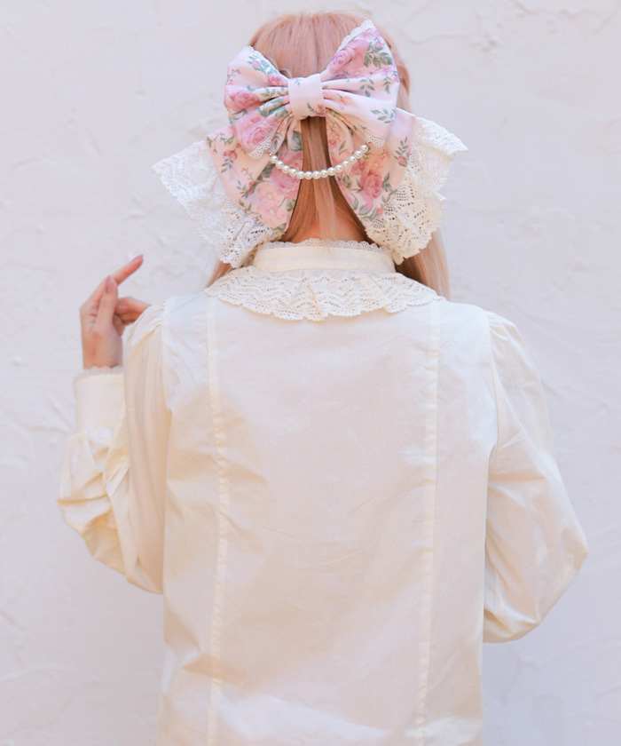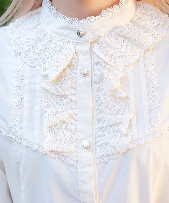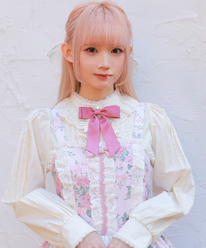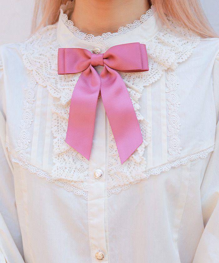 【設計】 立領搭配托ーション蕾絲、細緻打褶(Pin tuck)與霧面緞帶蝴蝶結點綴,呈現優雅的古典風格設計。