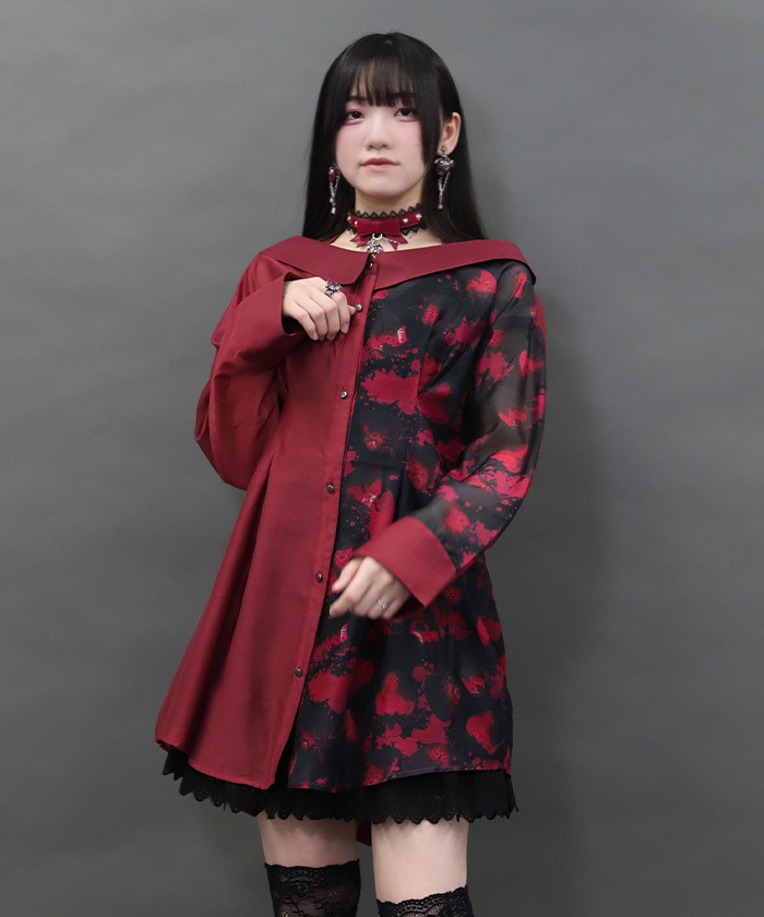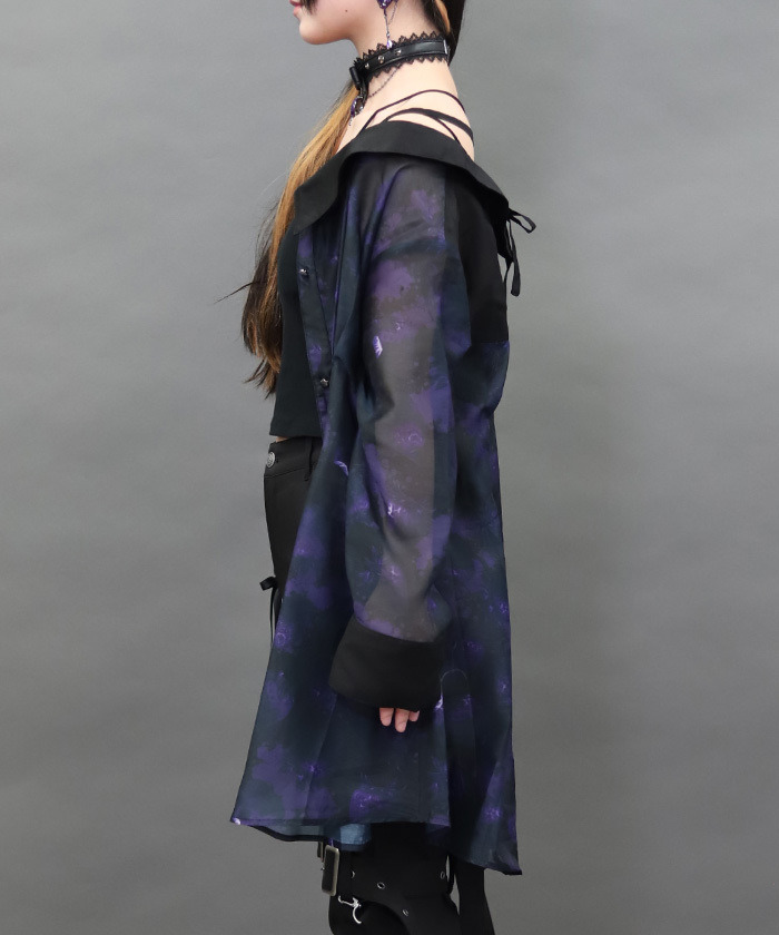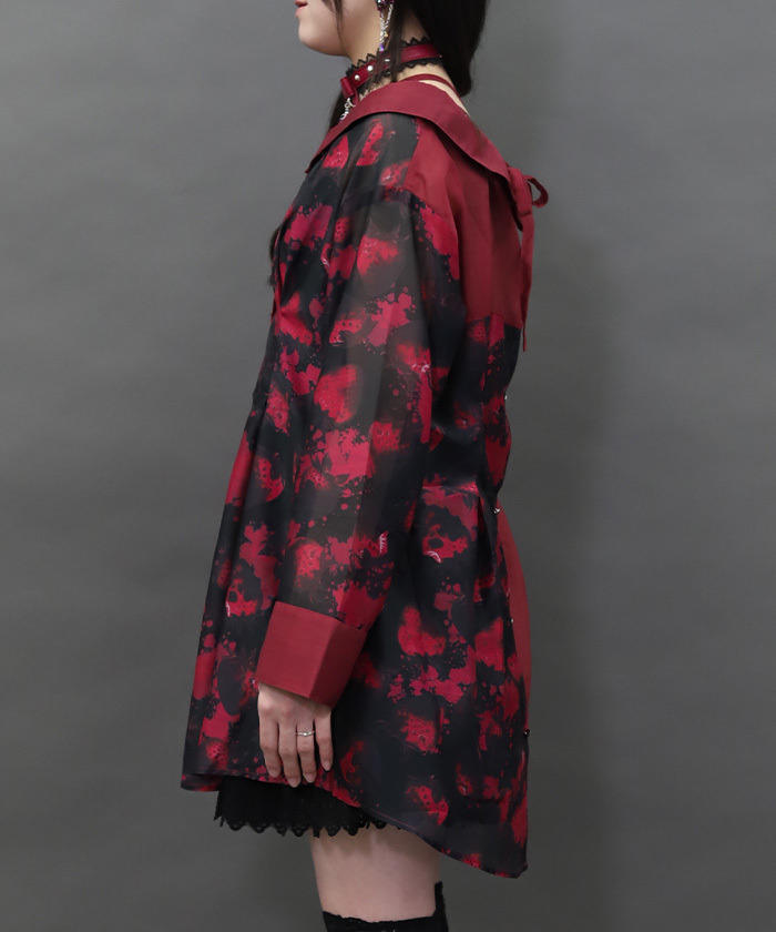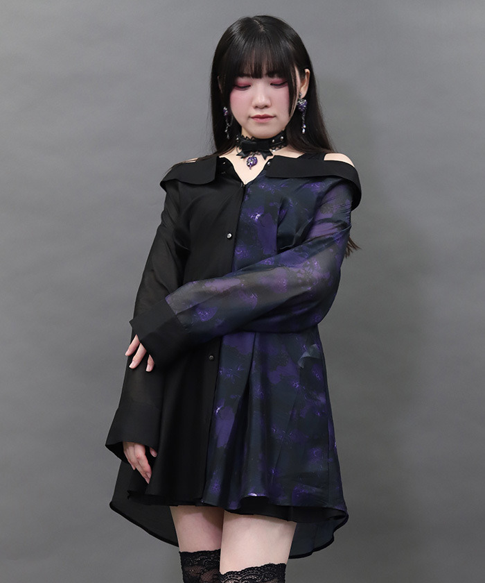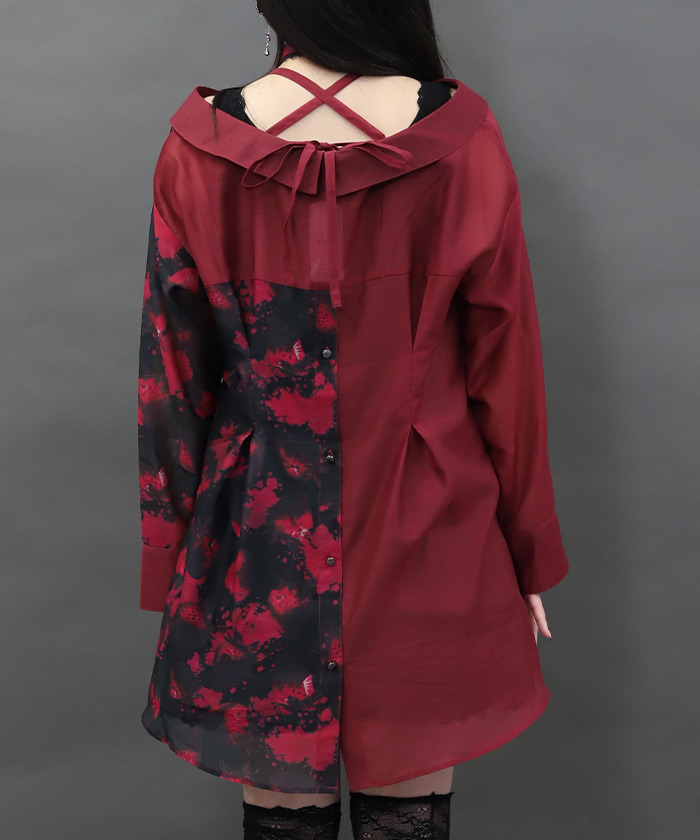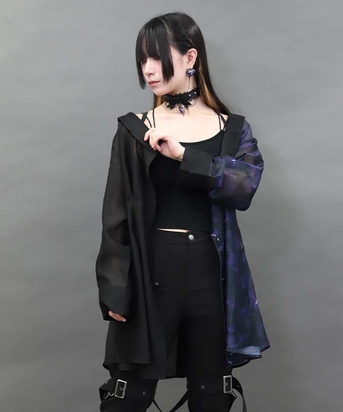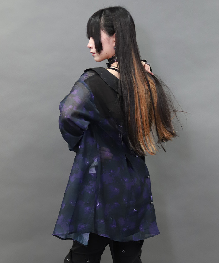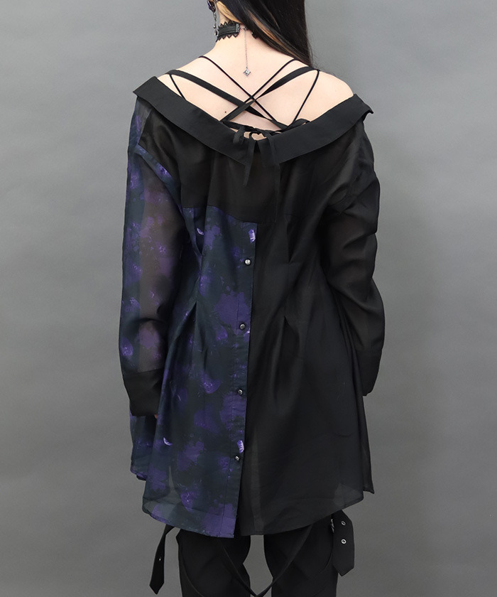 【設計】 使用透視感材質的雙色襯衫,結合素面與印花設計,印花中隱藏毒莓圖案。後背設有扣子,可創造多種穿搭風格,清爽又時尚。