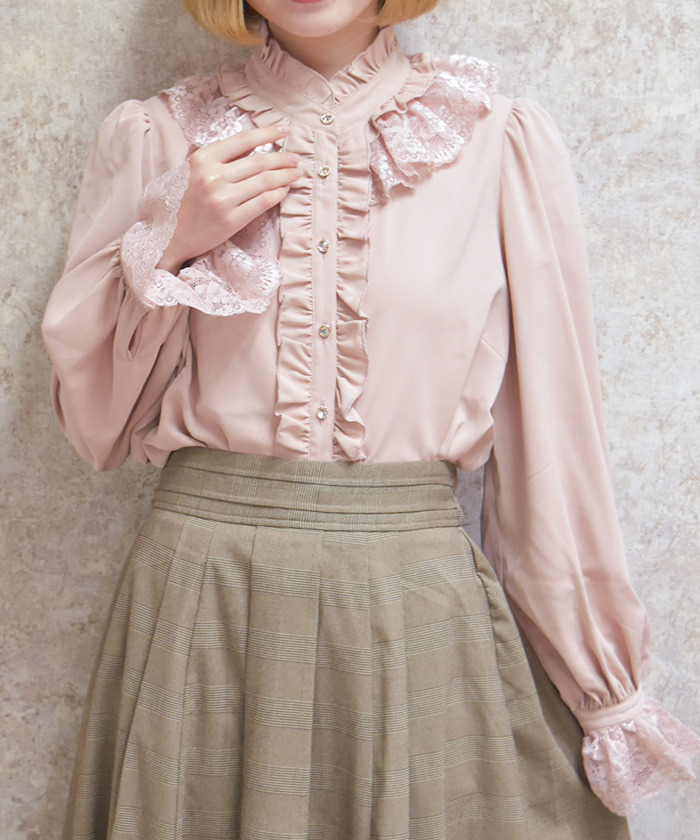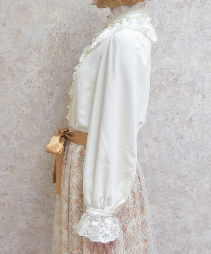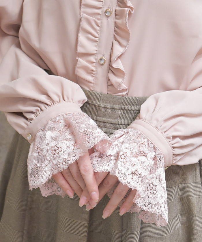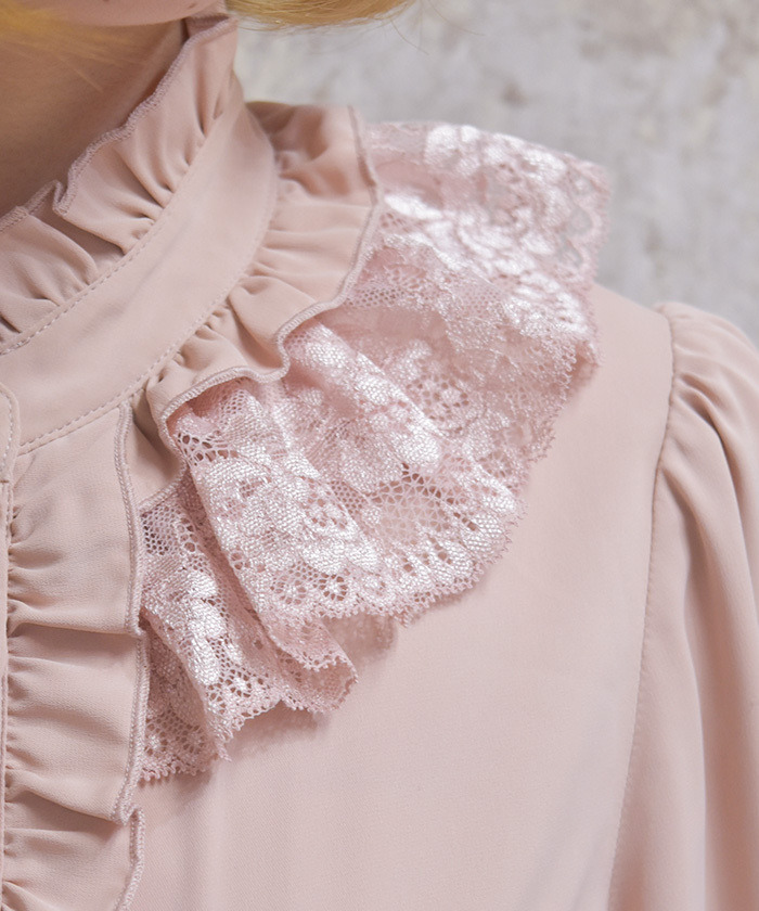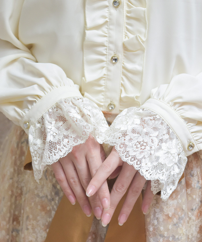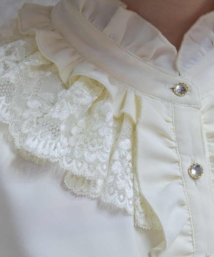 【商品設計】 採落肩柔軟垂感面料,穿著舒適且呈現優雅氣質。上衣以華麗荷葉邊為設計亮點,搭配立領剪裁營造頸部修飾效果。袖口配有寬版蕾絲與可開合扣設計,微微喇叭的袖型增加甜美感,整體華麗卻不失精緻感。