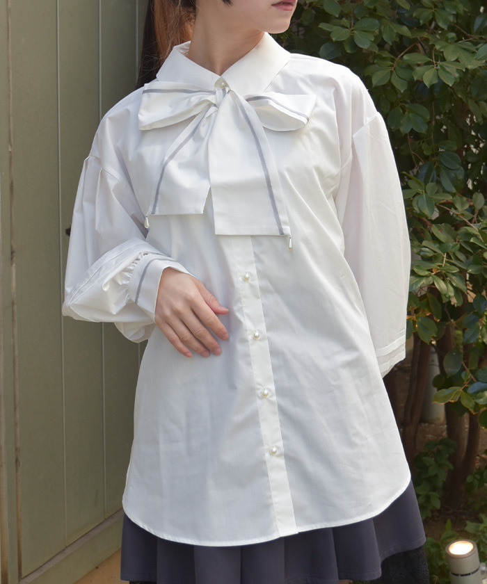 【商品介紹】 以流行感十足的大蝴蝶結為亮點的領結襯衫。 採用寬鬆 Oversize 版型,穿著自在、不易貼合身形曲線,是令人安心的設計。 後領加入打褶設計,整體線條俐落,衣襬自然展開成 A 字輪廓。