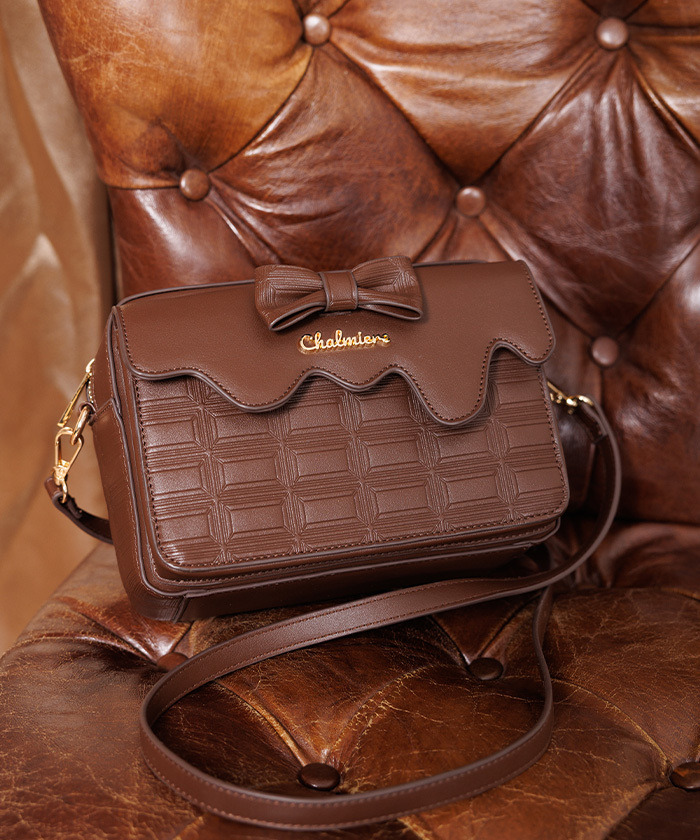 【設計】 採用仿皮革壓紋設計,呈現板巧克力質感。小巧尺寸適合日常出遊,既可愛又實用,是甜美風格的亮眼小包款。