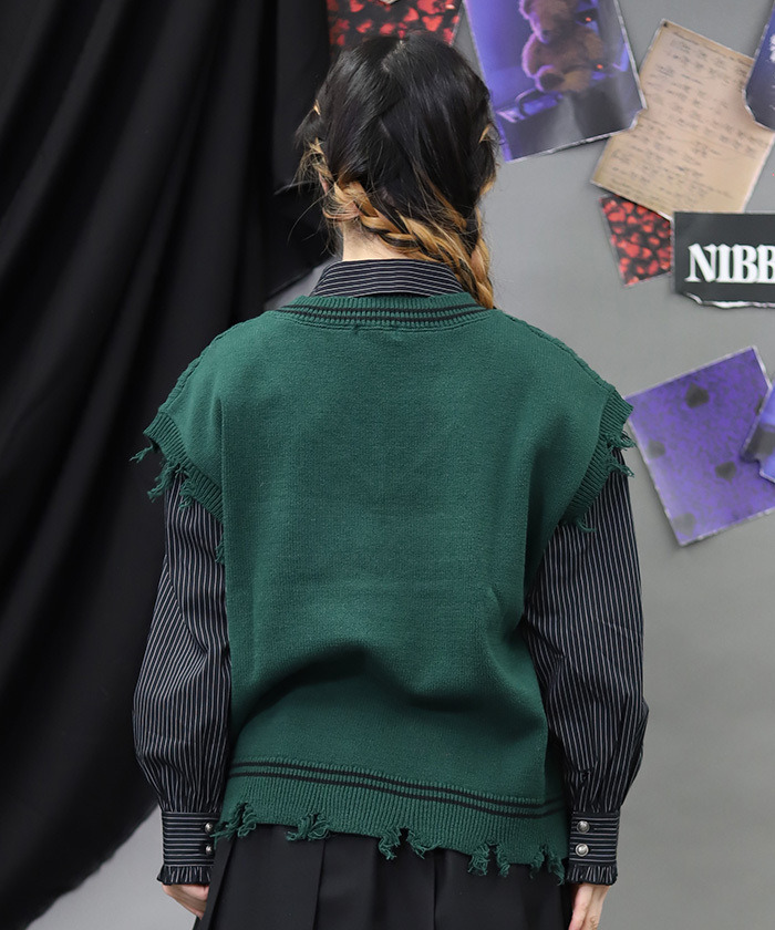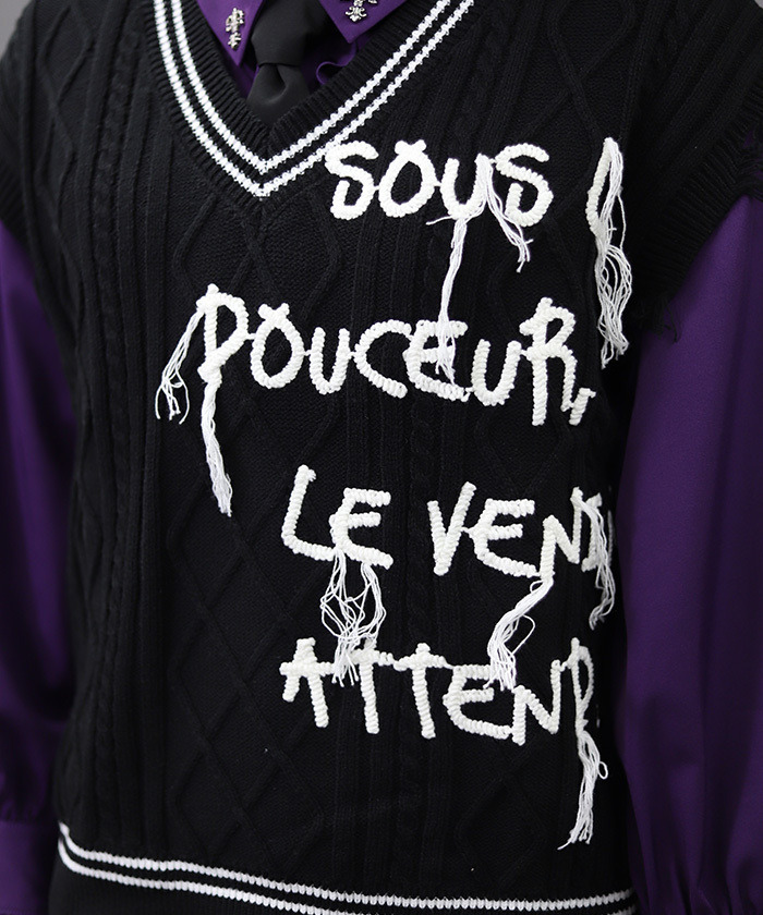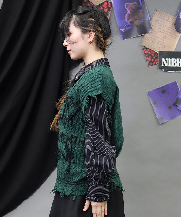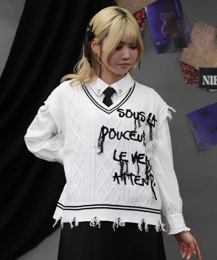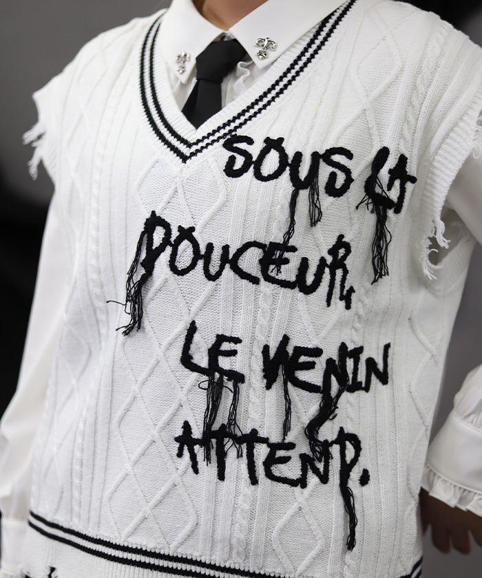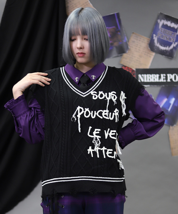 【設計】 將學院風穿搭不可或缺的絞花針織背心,以 NIBBLE POISON 的風格重新演繹。透過破壞感設計與刺繡垂落線條,營造出帶點個性與率性的硬派氛圍。 「甜美之下潛藏毒性」的訊息成為造型亮點。不僅可搭配襯衫,也能搭配棉質上衣,換季時節特別實穿百搭。