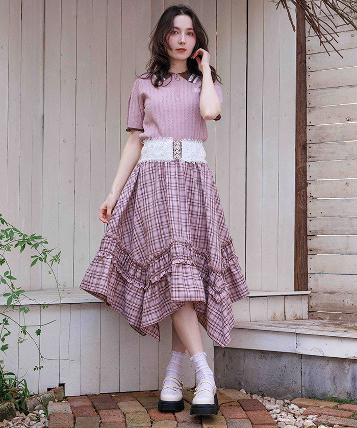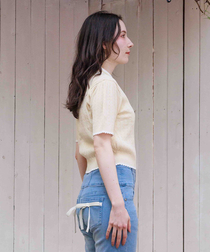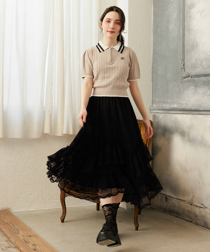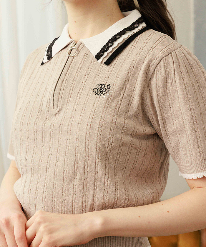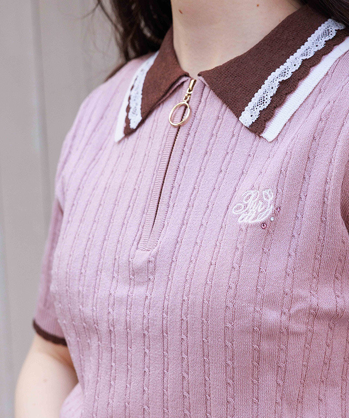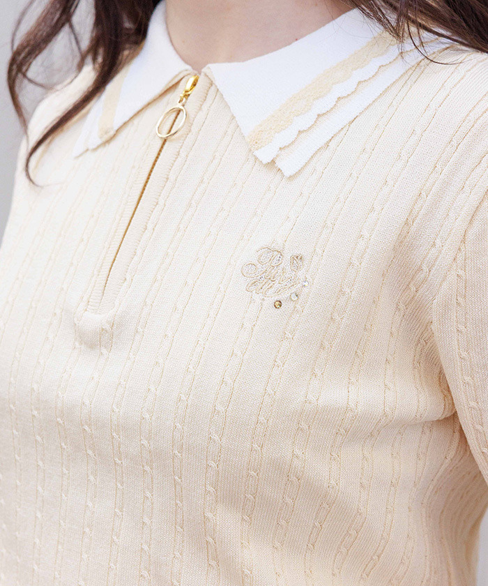 【設計】 胸前點綴鬱金香刺繡,搭配不同尺寸及色彩的亮片細節,增添精緻感。領口採用摺邊與尼龍蕾絲拼接設計,袖口與下擺也運用配色切換,呈現甜美細節。柔軟針織材質具良好伸縮性,穿著舒適。