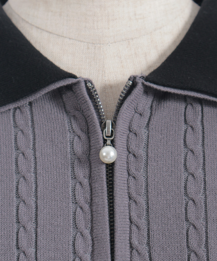【設計細節】胸前有單點精緻 Logo 刺繡,增添質感。設計師特別注重配色細節,採用雙層領設計,領子邊緣以扇形波浪邊 (Scallop) 搭配尼龍蕾絲,線條充滿甜美氣息。袖口和下襬也運用配色線條,讓整體造型更加統一和完整。半開襟拉鍊的拉鍊頭更貼心使用了珍珠吊飾,在小細節中展現優雅。