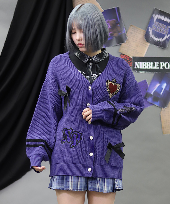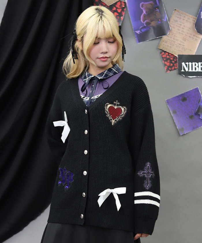 【設計】 大膽點綴刺繡布章與蝴蝶結的針織開襟衫。 以條紋滾邊營造學院女孩風格為設計亮點。 較長版的衣長增添恰到好處的慵懶隨性感。