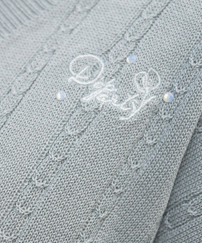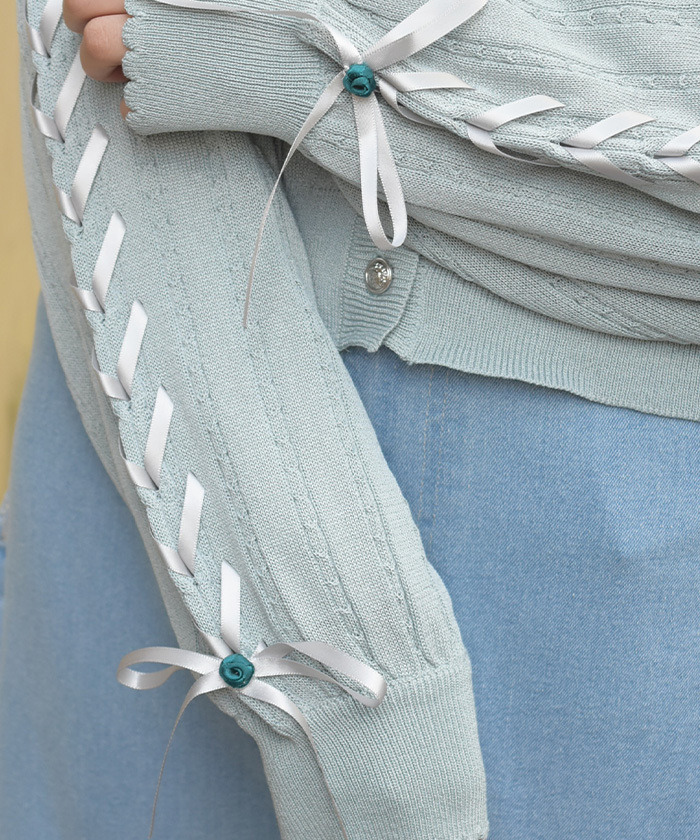【設計】 袖子採用緞帶穿繩綁帶設計,增添細節感與造型亮點。 緞帶中央點綴玫瑰裝飾,提升整體甜美氛圍。 胸前繡有一朵甜豌豆刺繡,低調中帶有精緻感。