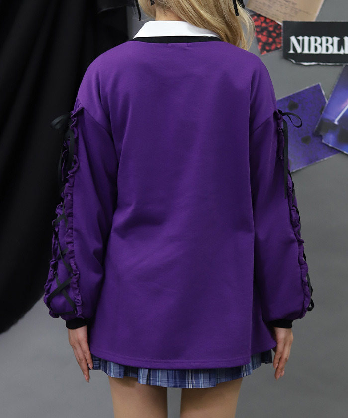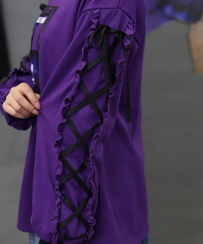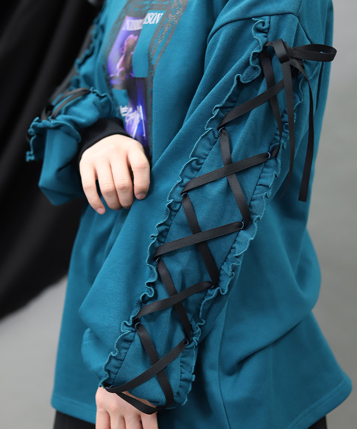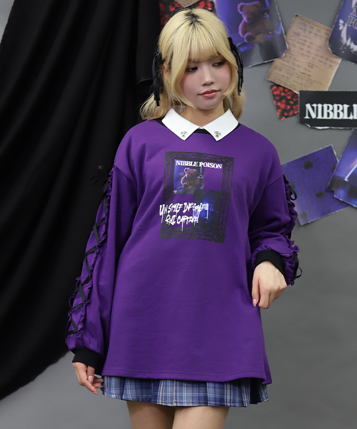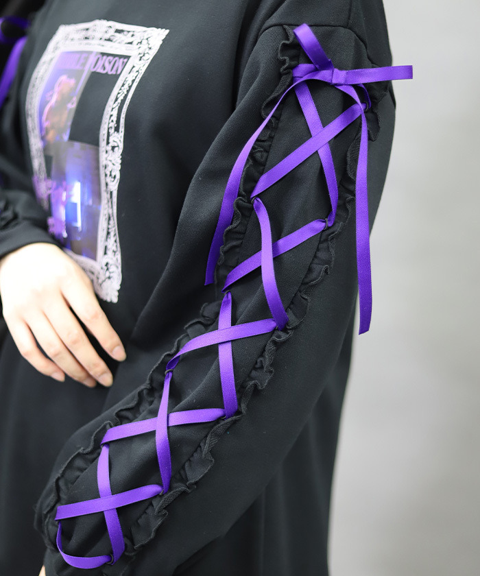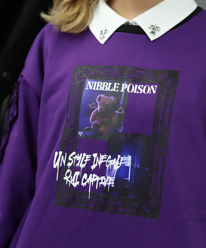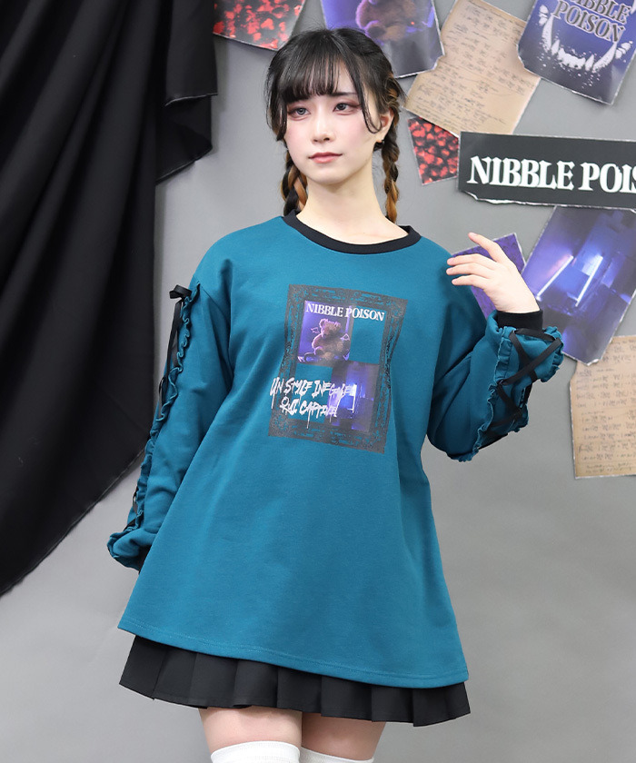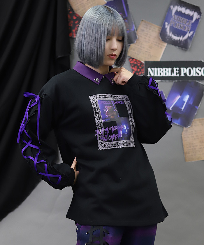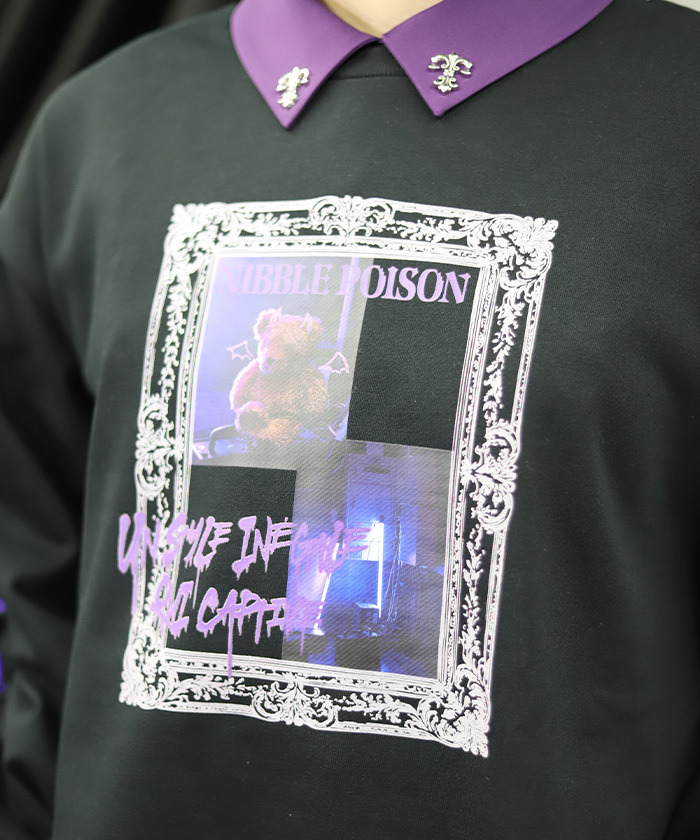 【設計】 以哥德風相框構圖呈現的照片風印花為設計亮點。塗鴉風圖樣與帶點惡作劇感的泰迪熊圖案,為整體增添可愛又帶點叛逆的氛圍。袖口加入綁帶與荷葉邊設計,使整體更具哥德風格特色。