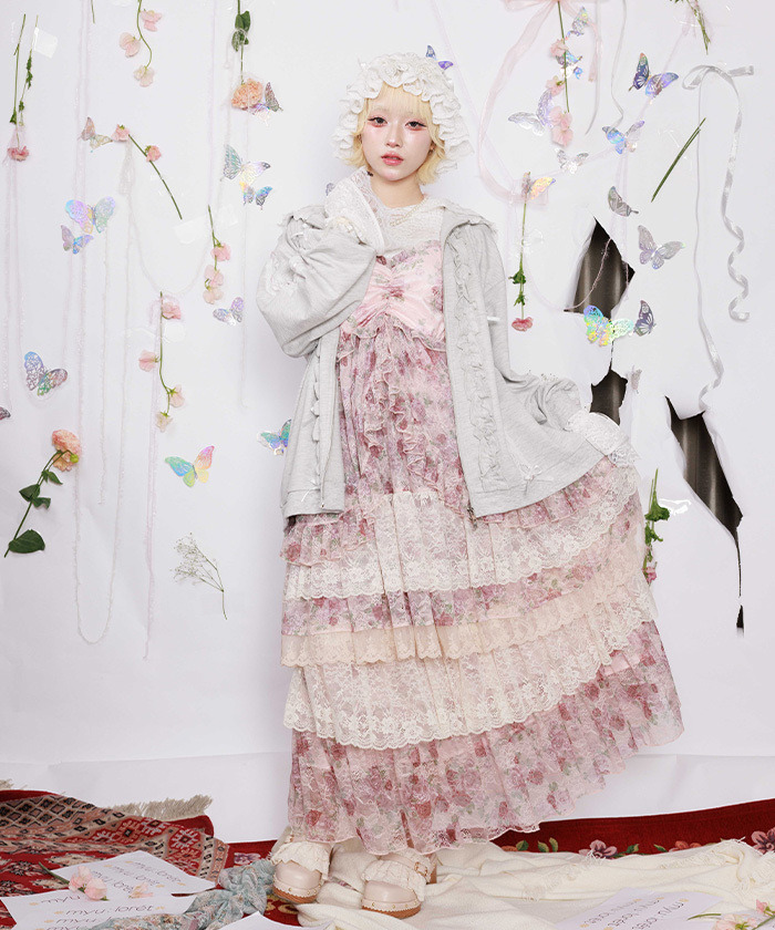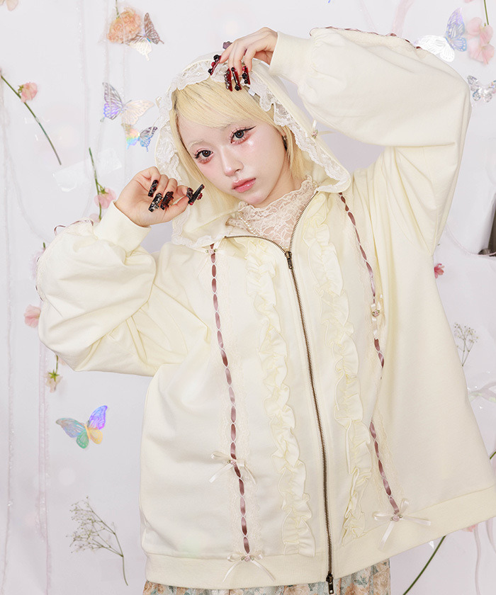 【設計】 外套整體寬鬆,展現時尚輕盈感;帽子周圍與背部運用蕾絲、荷葉邊、蝴蝶結及玫瑰元素裝飾,背面加入蕾絲綁帶設計,細節精緻,前方雙拉鍊可調整搭配,增添多樣造型可能。