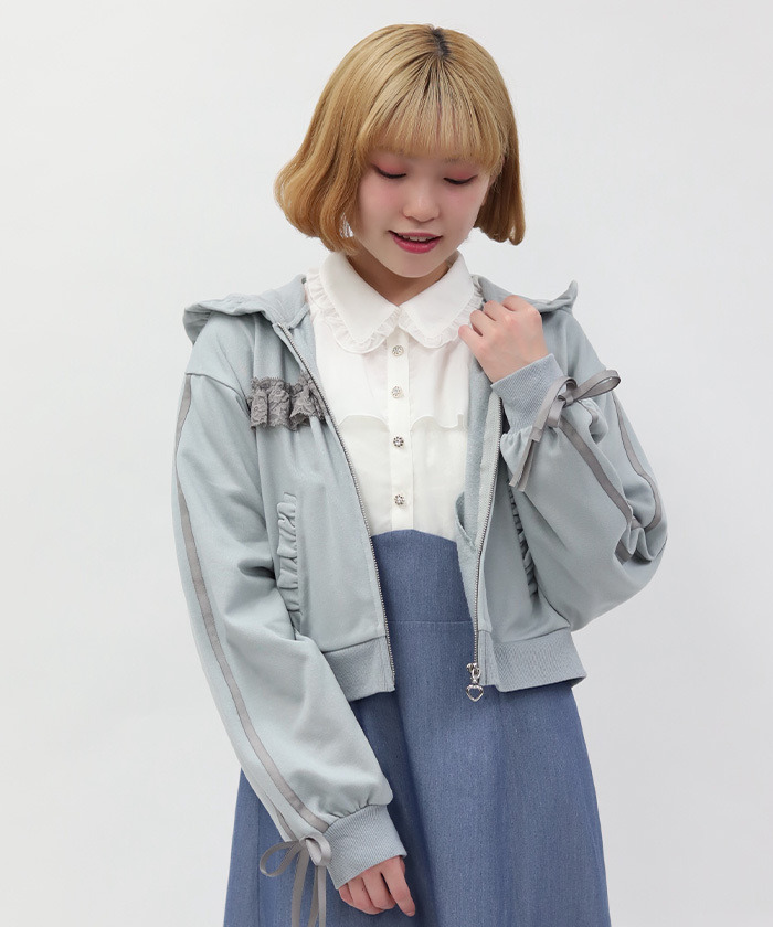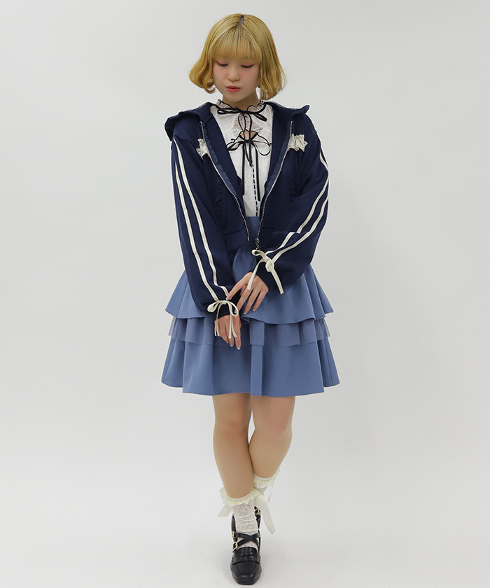 【設計】 運用配色蕾絲與蝴蝶結作為裝飾細節,展現可愛氣息。荷葉邊設計帶來甜美氛圍,而線條元素則加入些許運動風格,使整體呈現甜酷混搭的特色。